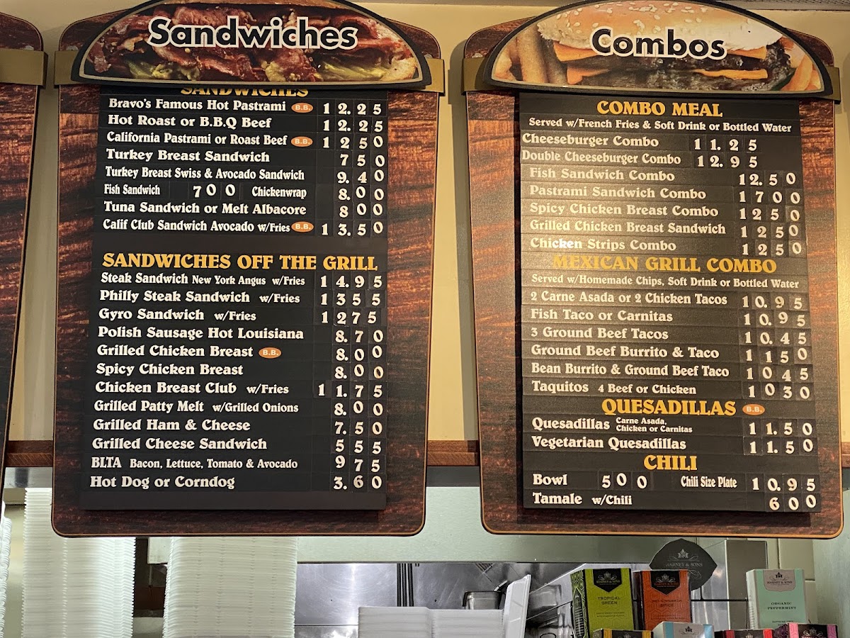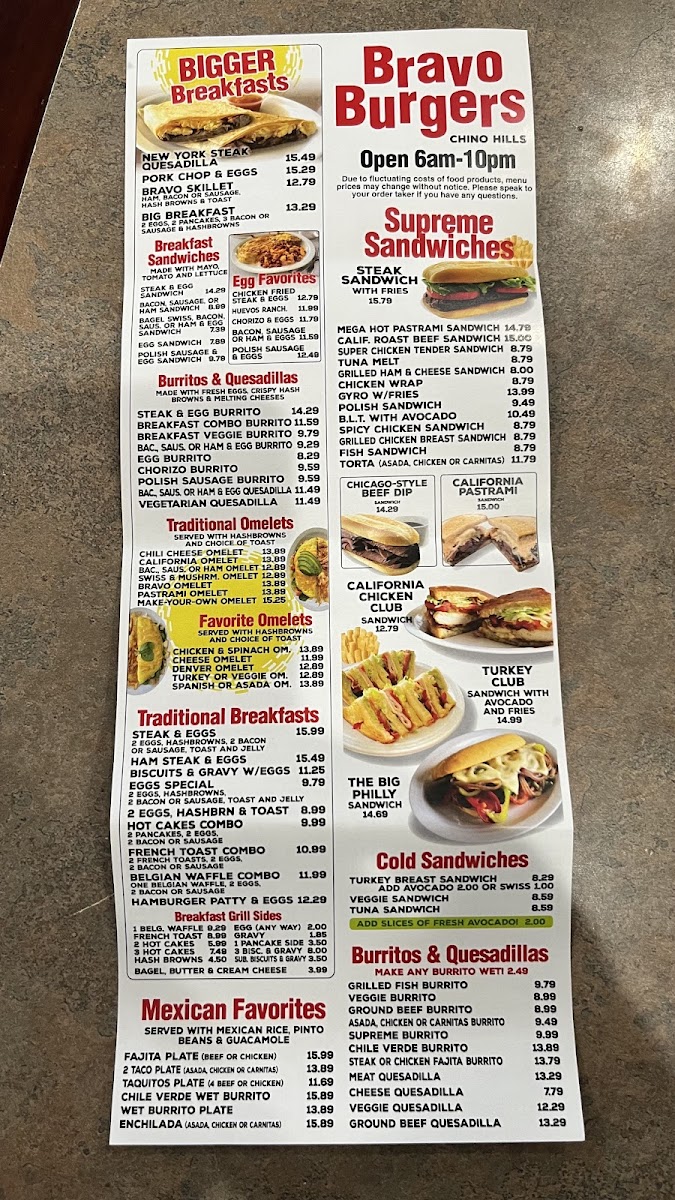 The menu at Bravo Burgers offers a variety of traditional American dishes with a focus on hamburgers, sandwiches, breakfast items, and salads. It is designed to serve a range of dining needs from breakfast to casual lunch or dinner.