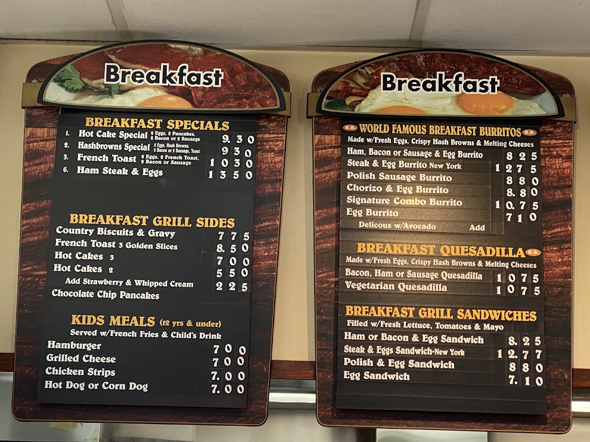 - Breakfast Items: The menu includes breakfast burritos, omelettes, sandwiches, and combos, suitable for morning dining or brunch. Items such as the Signature Combo Breakfast Burrito and French Toast Combo are examples.